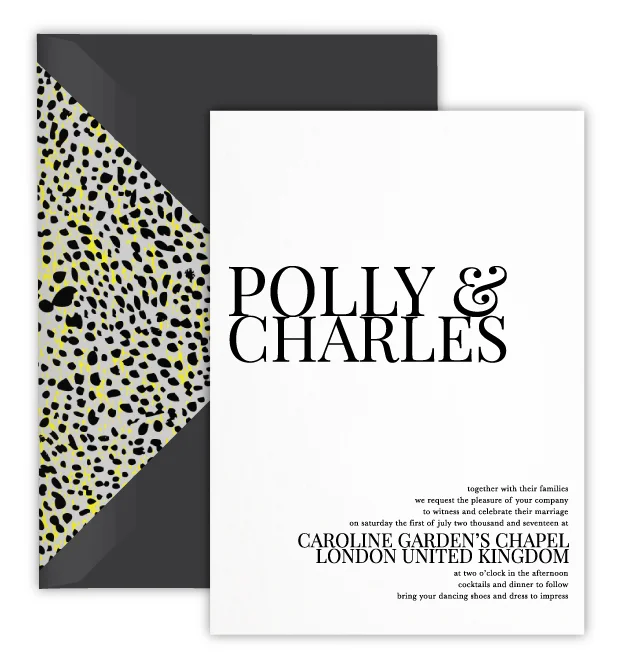 The Polly suite is a modern classic invitation suite with the focus on beautiful typography and fuss free design. Sophisticated and ultra modern this suite is designed with a very discerning couple in mind. A patterned envelope liner brings a wonderfully unexpected detail to this ultra minimal design. The perfect suite for a stylish and understated wedding.